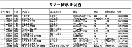 联招金融AIX工程师定岗培训班518一班学员9月28日全部顺利结业,并创就业佳绩! 本期14人全部高薪就业,平均薪资7.5K,最高薪资达到11K,实实在在的就业数据、超过预期的就业薪资都是对联招定岗项目最宝贵的好评。
