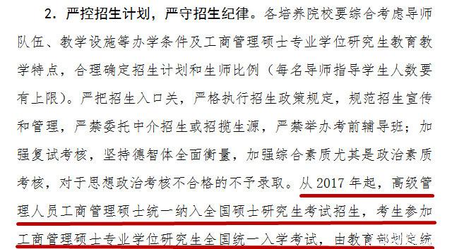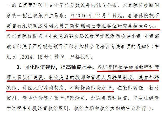 近日,教育部发布文件《教育部关于进一步规范工商管理硕士专业学位研究生教育的意见》,文件称 2017年起,高级管理人员工商管理硕士(EMBA)将纳入全国统一的硕士研究生入学,由教育部统一划线、各学校按需调整录取。且从2016年12月1日 开始,各院校不得再自行组织EMBA招生考试。