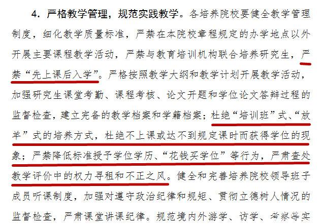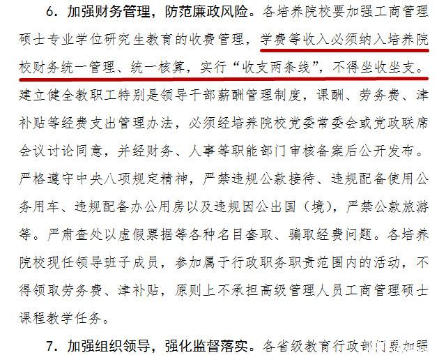 《意见》中还要求EMBA院校严肃课堂纪律,严格审查论文答辩制度,拒绝“放羊式”、“培训式”管理方式,保 证毕业生的理论实践水平。在师资聘用方面,原则上行政管理人员不得担任教学任务,对教师资质进行审查把关。国家也会全国70多所EMBA院校及中外合作办 学项目进行教学效果审查和财务廉政考核,对有严重违纪的院校进行警示和督导。