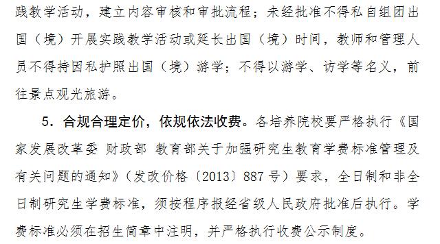 《规范意见》提到,各院校应该严格执行相关规定要求,全日制和非全日制研究生学费标准,须按程序报经省级人民 政府批准后执行。学费标准必须在招生简章中注明,并严格执行收费公示制度。同时,学费等收入纳入培养院校的财务统一管理、统一核算,并健全教职工薪酬管理 制度,实行“收支两条线”。